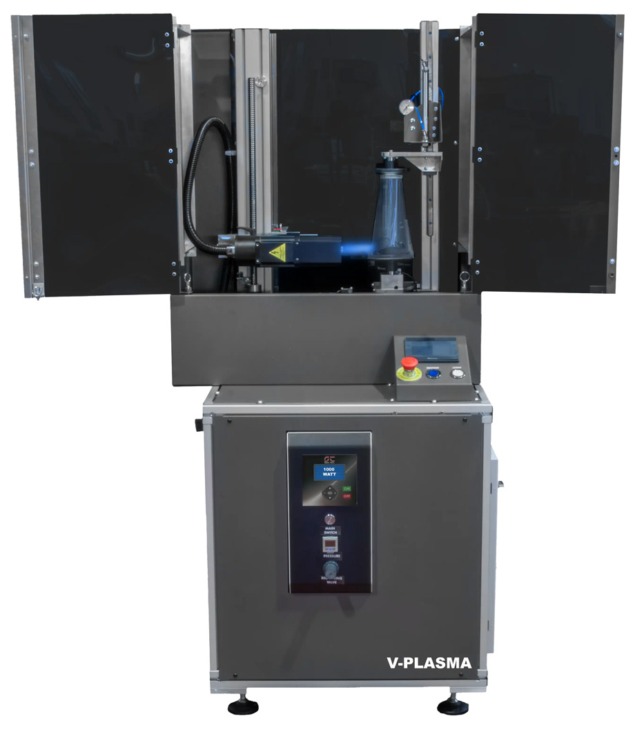 il nuovo plasmatore verticale sviluppato dal reparto R&D per il trattamento di oggetti cilindrici e conici come bottiglie, borracce, bicchieri, lattine e flaconi cosmetici e oggetti di design conici fino a 15°,V-Plasm lavora su un’area di trattamento compresa tra 25 e 160 mm di diametro, offrendo la massima versatilità per diversi settori produttivi