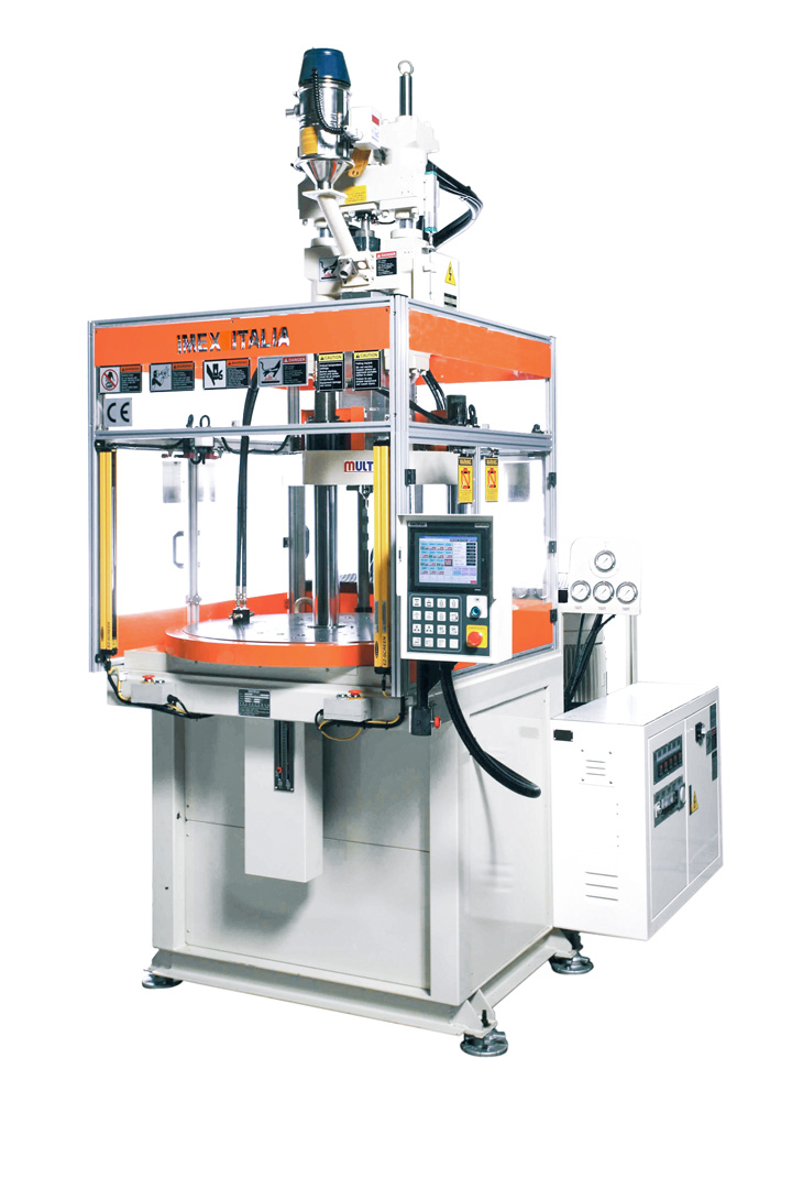 Mentre nella prima stazione la pressa effettua l’iniezione, contemporaneamente nella seconda stazione (metà stampo inferiore) l’operatore, o eventuali manipolatori/robot, possono scaricare i pezzi stampati e posizionare eventuali inserti.