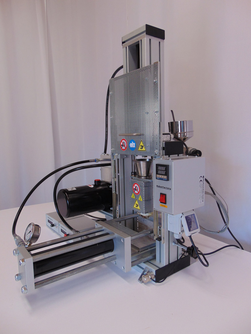 Il nuovo progetto di Robot Factory Srl adotta una struttura a portale per assicurare una maggiore robustezza, rispondendo così alle nuove esigenze tecniche. Questo sistema è in grado di raggiungere una forza di estrusione fino a circa 2 t (1.900 kg) e viene fornito con una morsa che raggiunge in chiusura circa 4 t (4.300 kg).