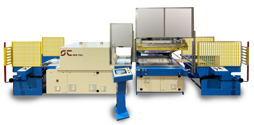 Rotopress P2-6T Auto – Pressa automatica a 6 piani rotanti con 2 testate riscaldanti. Integrata con moduli automatici A.T.P. per il carico, S.T.A. per la spellicolatura e R.A.T. per lo scarico