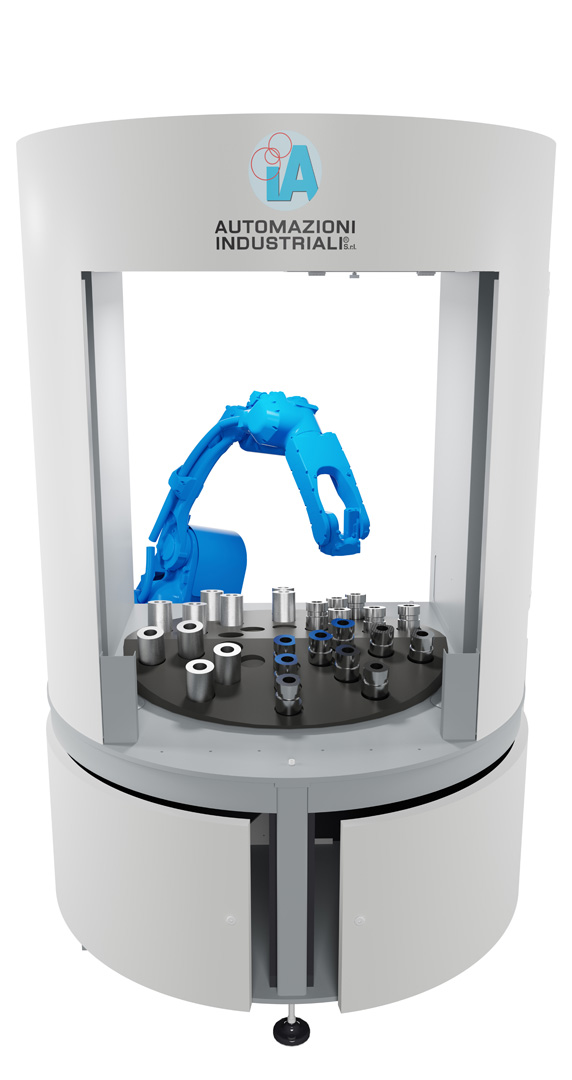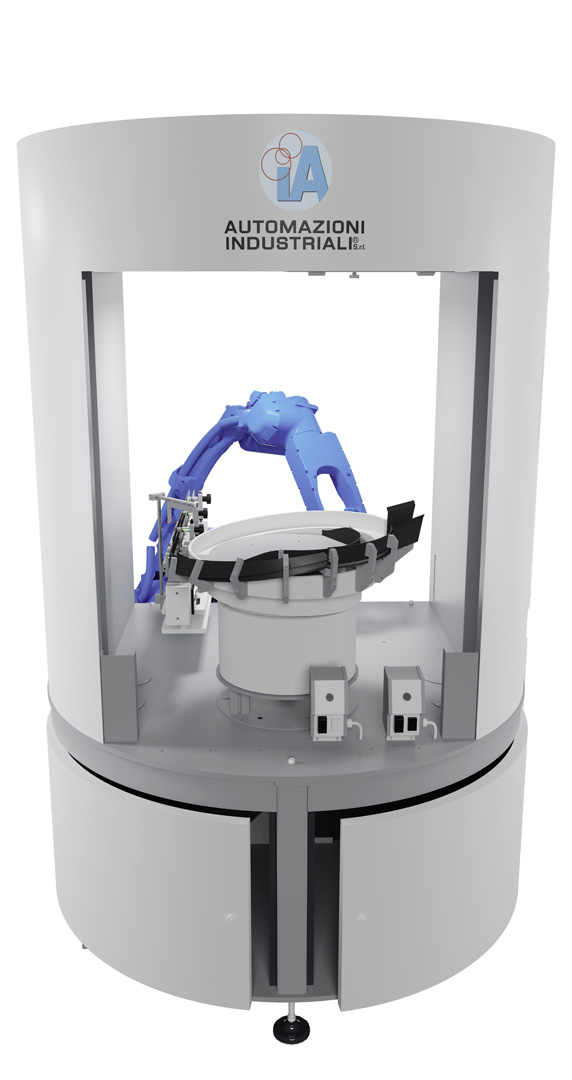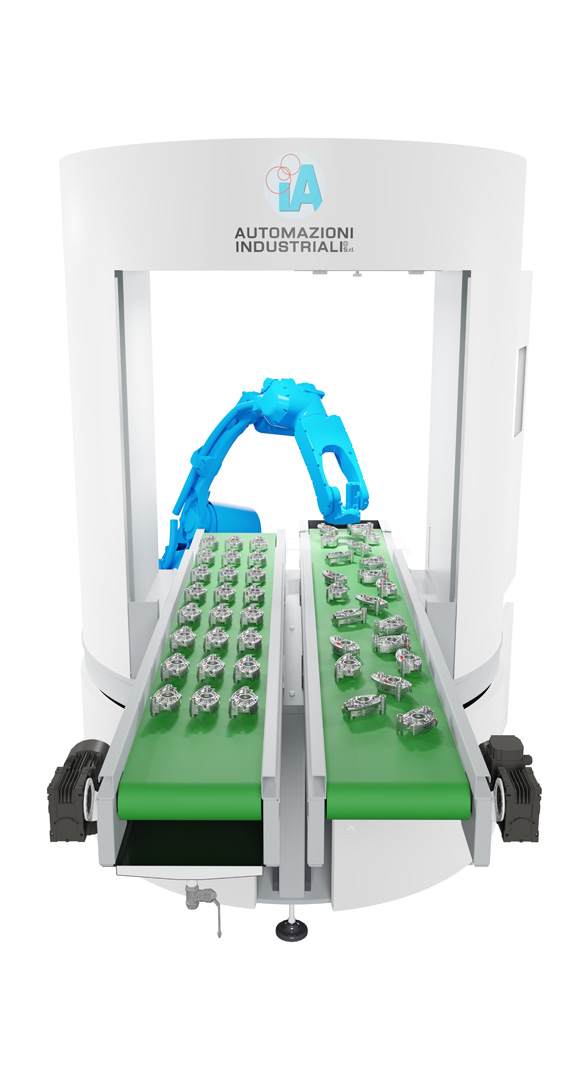È una soluzione estremamente compatta e con ingombri ridotti, perfetta per chi necessita automazione, ma ha limiti di spazio ed è particolarmente adatta per tempi ciclo alti.